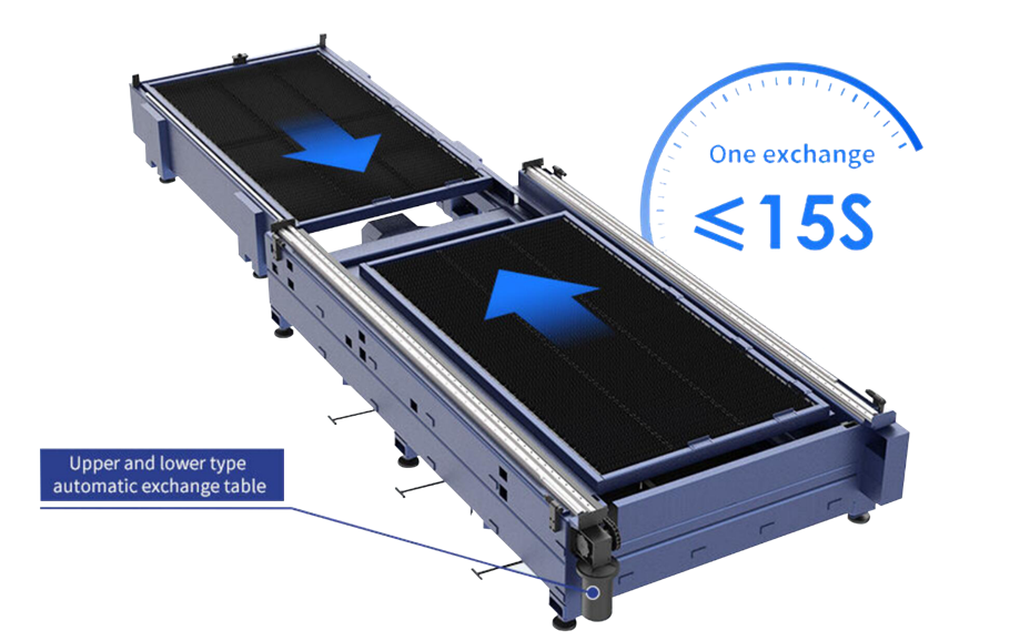Mesa de intercambio alta y baja desarrollada independientemente, diseño de estructura simple e inteligente, intercambio completo ≤15 segundos, eficiente y ahorro de costos de mano de obra. La parte delantera del motor es segura y anticolisión